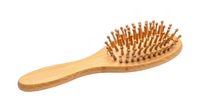 Hair care supplies arranged on a wooden plate.  A dark jar, small amber bottles, a yellow towel, and a black bristle hairbrush rest on a round wooden plate
