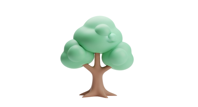 A stylized 3d render of a simple cartoon tree with light green leaves and brown trunk