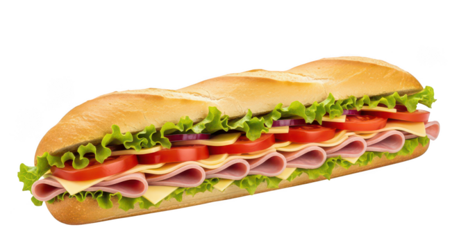 Ham and cheese sub with fresh vegetables, isolated on transparent background