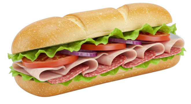 Italian sub sandwich with salami, pepperoni, ham, provolone cheese, lettuce, tomato, onion, and Italian dressing on a baguette, isolated on a transparent background