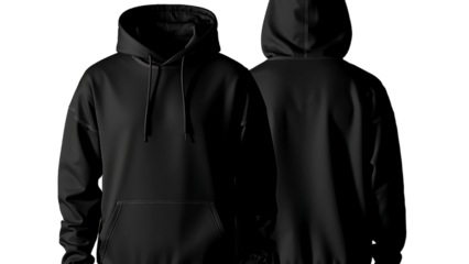 Mockup of black hoodie oversize, presentation on a hanger, unfolded, isolated on transparent background.