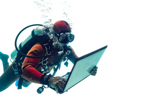 Scuba Diver with Laptop Conducting Research Isolated on Transparent Background