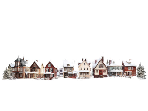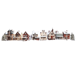 Charming pastel houses with winding road and trees on transparent background