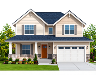 suburban house with front porch and garage, transparent background