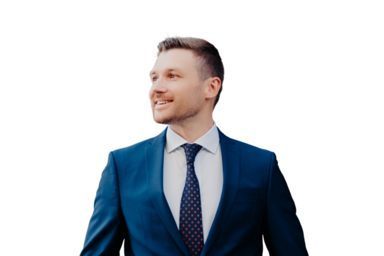 Cheerful manager dressed in formal outfit, has pleasant smile on face, being in good mood after successfully signed contract, poses outdoor against red background. People, success and job concept