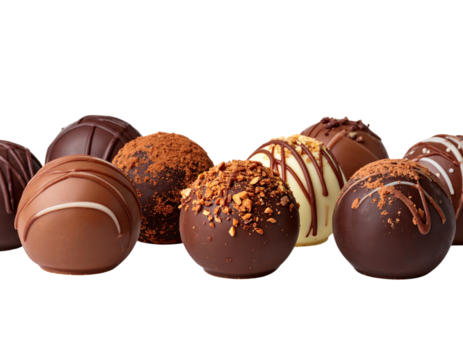 Single Row of Gourmet Chocolate Truffles with Cocoa Dust and Reflections, Perspective View, isolated on transparent background