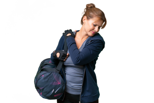 Woman, fitness and shoulder pain in sports injury, workout or training exercise accident. Fit and sporty female suffering bad arm pain, ache or discomfort isolated on a transparent PNG background
