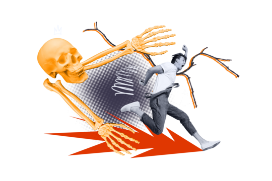 Composite trend collage of halloween autumn season spooky creepy poster mystery midnight young man suffer skull skeleton head hand bone