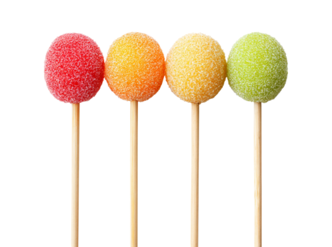 Four colorful sugar coated lollipops on sticks, Isolated On White, Transparent Background, Png Cut Out