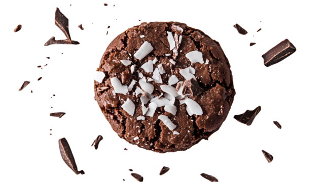 A single chocolate cookie with coconut flakes and chocolate pieces  view from above isolated on transparent background
