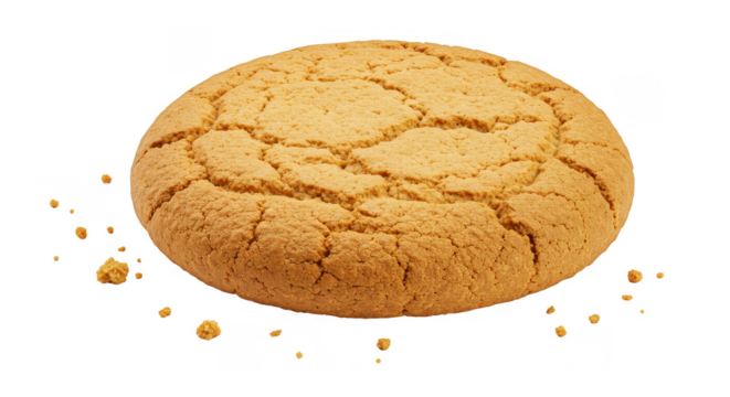 A single, rustic crunchy cookie with a textured surface and a scattering of nuts placed centrally on a clean white backdrop