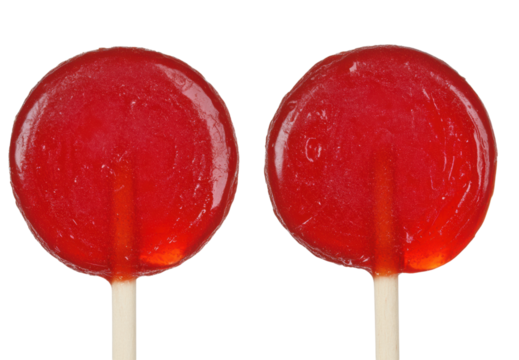 Two bright red lollipops on wooden sticks, showcasing their glossy surface and circular shape.