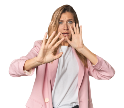 Transparent businesswoman closing ears in grey suit unbothered expression