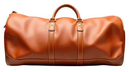 Classic brown leather satchel briefcase with brass hardware isolated on transparent background