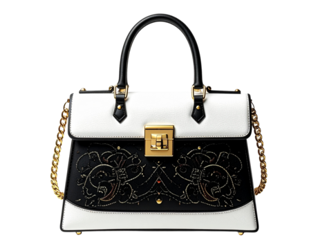 Front View of Black and White Embroidered Handbag with Shiny Gold Chain, Isolated