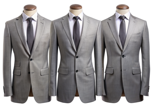Three grey suits are displayed on mannequins. Each suit is shown from the front, side, and back