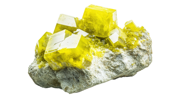 Sulfur crystal with a vibrant yellow color and rough texture, isolated on a empty plain background
