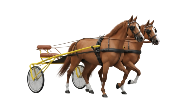 Isolated team of two horses in harness pulling yellow sulky. Sporting equipment view