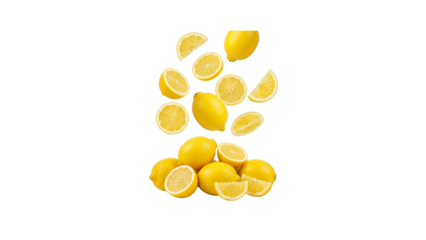 Fresh Lemons Whole and Sliced Falling Composition Isolated Transparent Background, Citrus Fruit Concept, PNG