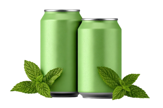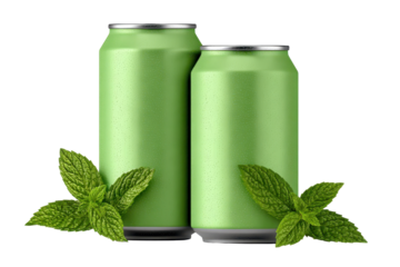 Two green beverage cans paired with fresh mint leaves, crisp aluminum reflections, minimal packaging style, and refreshing drink concept isolated on transparent background.