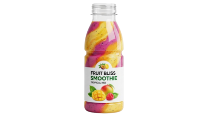 Clear plastic bottle of Fruit Bliss Smoothie Tropical Mix with vibrant yellow and pink swirled liquid and fruit label on white background.