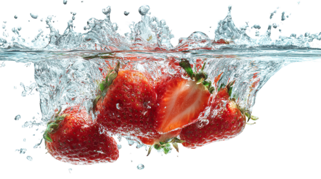 Fresh strawberries splash into crystal clear water, creating dynamic ripples and vibrant energy for healthy eating and summer refreshment promotion