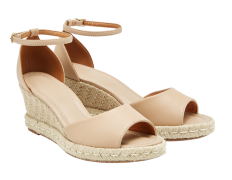 A pair of womens wedged sandals rest gracefully on a pristine white background