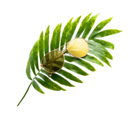 Sunglasses resting on tropical leaf for summer vacation theme on a transparent background, cut out