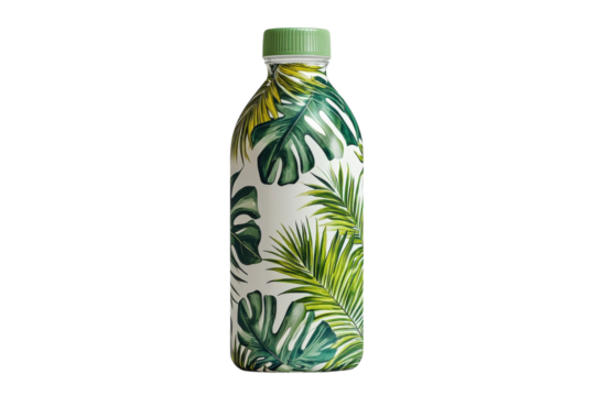 A refreshing tropical escape bottled in vibrant green and white palm leaves, a sleek design perfect for summer adventures with a light green cap.