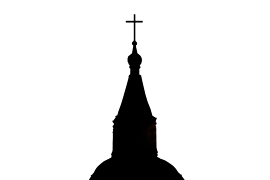 Silhouette of the catholic church at sunset, isolated on a white background. The setting sun shines on the dark christian cathedral.