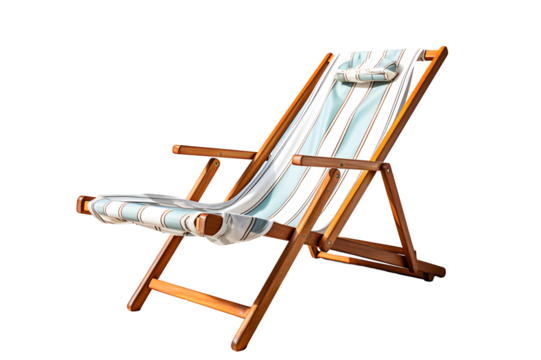 Striped blue deck chair or beach chair isolated on cut out PNG or transparent background.Used for sitting or lying down to relax at various tourist attractions. Realistic clipart template pattern.