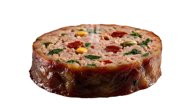 Slice of meatloaf with sun dried tomatoes and herbs on black background food cooked