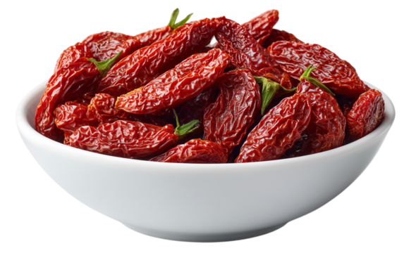 Red dried peppers fill a white bowl; glossy texture, product photography, posters.
