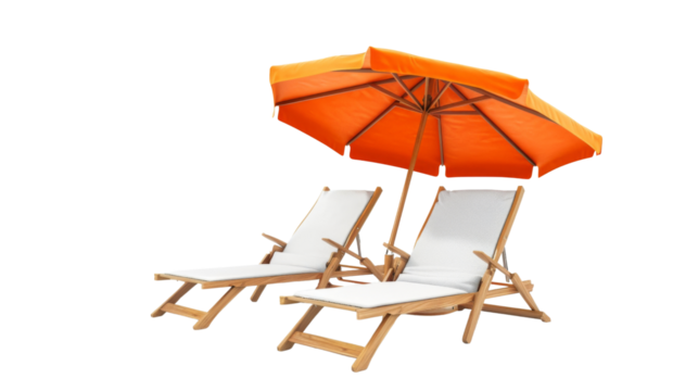 Wooden sun loungers and side table for outdoor relaxation with isolated transparent background