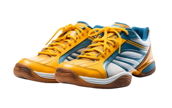 A pair of yellow and black knee pads lying on a wooden floor