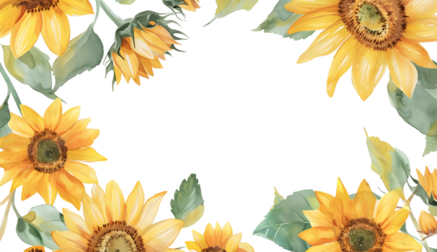 Watercolor sunflower wreath creating a frame with yellow flowers and green leaves on transparent background