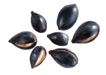 A pile of shelled sunflower seeds scattered in a circular pattern isolated on transparent background