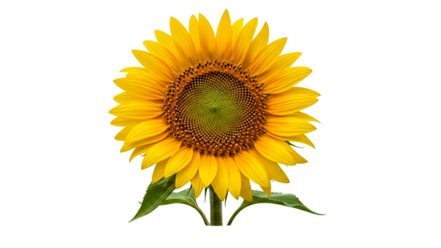 Photo of a sunflower with yellow petals, green stem, wide leaves, dark center, backdrop, front view, isolated on transparent background