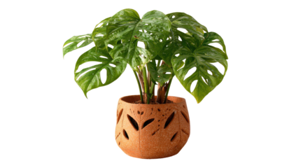 A vibrant Monstera plant with large, perforated leaves in a decorative, terracotta-colored pot