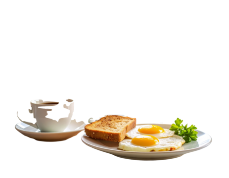 "Rustic Morning Breakfast Plate with Eggs, Toast, and Coffee in a Cozy Sunlit Room, Transparent Background"