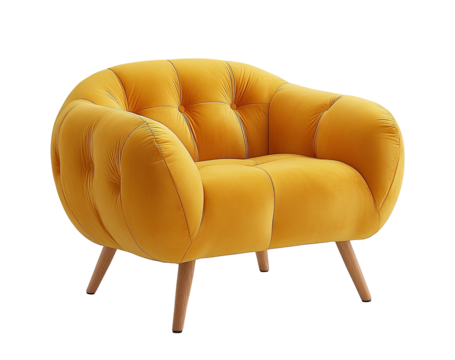 Sunny yellow armchair with button tufts & wood legs, cozy and inviting