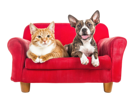 dog and cat relaxing together on bright red sofa, enjoying sunny day. Their playful expressions create warm and cheerful atmosphere