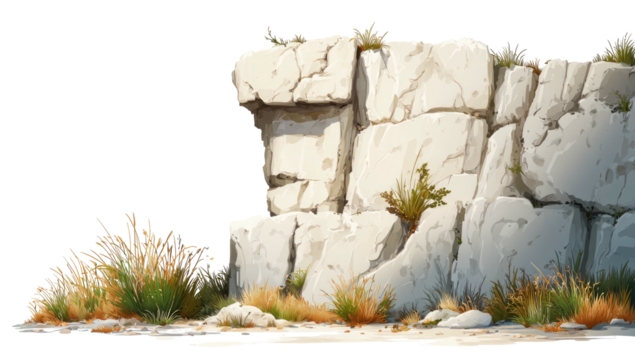 Whitish, layered stone wall and foreground grassy area, set against a black backdrop, sunny
