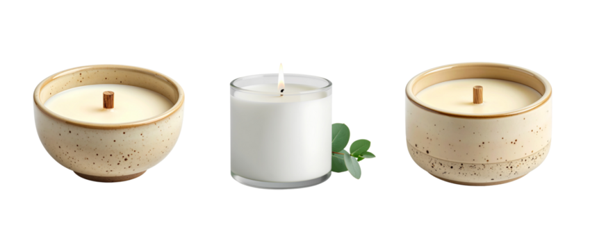 Ceramic and glass soy candles, PNG isolated on transparent background, minimalist spa collection, realistic 4K wellness product