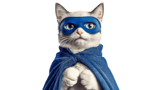 superhero cat, Cute cat with a cloak and mask jumping and flying on white isolated background