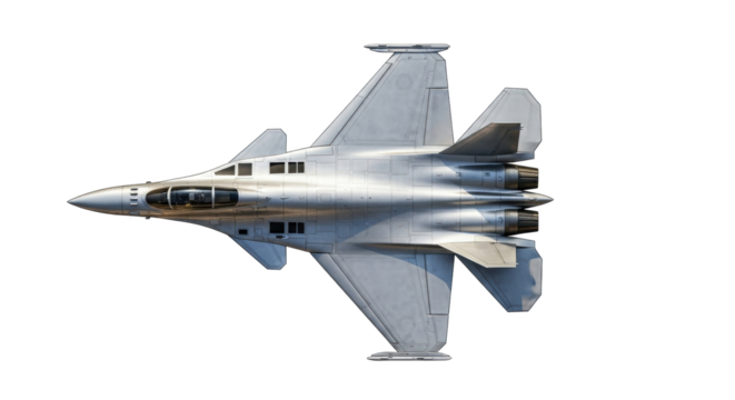 Military stealth aircraft with dual vertical stabilizers top frontal perspective, isolated on a transparent background