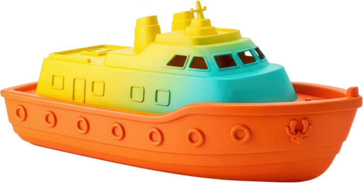 Brightly colored plastic toy tugboat with orange hull and ombre yellow to turquoise superstructure featuring a detailed deck and playful design toy boat colorful gradient transparent background