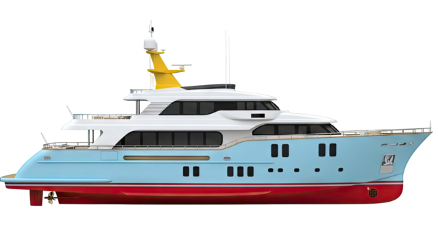 Luxury motor yacht, with white superstructure and blue hull docked, isolated on transparent background. PNG