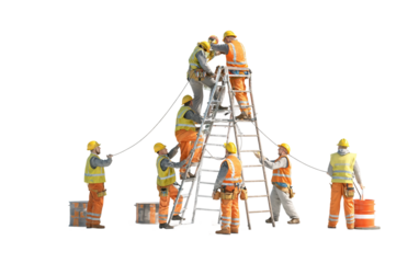 Construction workers working as a team lifting ladder with focus on safety and organization isolated on transparent background PNG