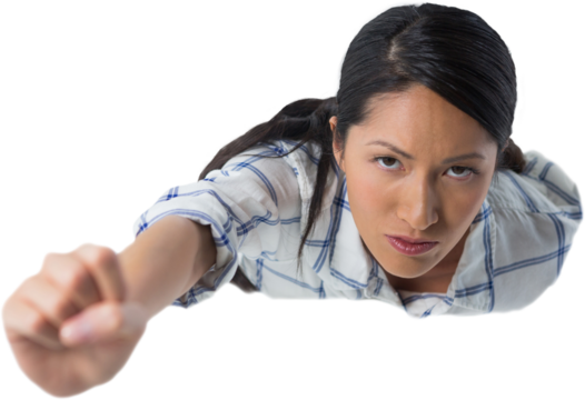 Motivational superwoman demonstrating empowerment transparent background